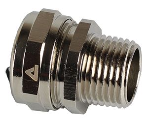 - KonstruktionMessing vernikkelde koppeling, bestaande uit 4 delen (wartel, klemring, aardingshuls en huis).